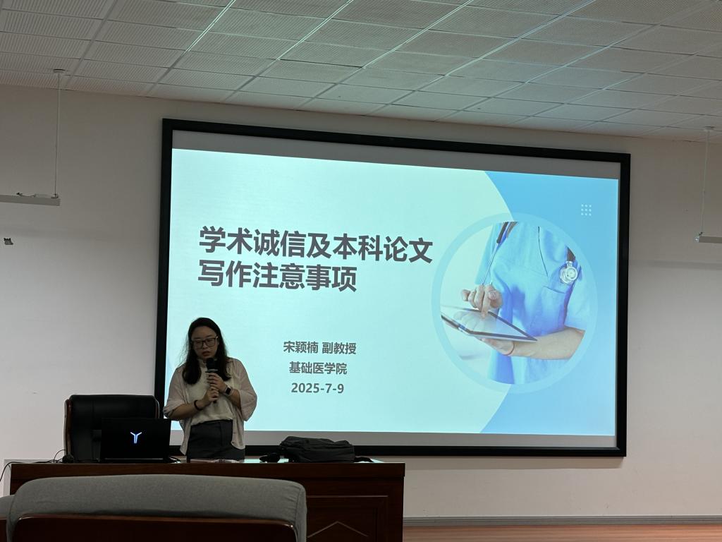 为了培养员工系统掌握毕业论文写作规范,提升学术论文撰写能力,确保毕业论文质量符合学术标准。2025年7月9日上午10点,公司举办了“学术诚信及本科论文写作注意事项”讲座,由宋颖楠副教授主讲,2021级基础医学班及2022级医学实验技术班全体员工参加讲座。