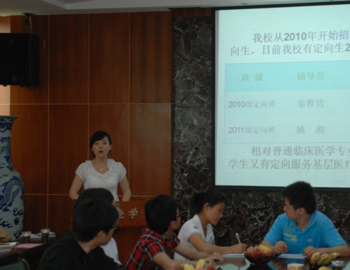 首先辅导员秦雅倩老师汇报了2010级、2011级定向班的基本情况和进校后取得的成绩。教务处副处长温小军详细介绍了农村订单定向医员工免费培养工作相关政策,深入浅出地剖析了全科医生的内涵和发展前景,特别强调了服务基层的重要性。员工处处长周嫆言简意赅地说明要做好基层医疗的服务工作,必须提高员工的组织能力和人文素质。WilliamHill体育经理徐国强语重心长地对定向生提出两点期望,一要有扎实的临床知识,二要有沟通能力。交流中,师生们畅所欲言,各抒己见,发自肺腑,科任老师们对定向班员工刻苦的学习态度及良好的课堂纪律给予了高度的赞扬和肯定,也纷纷为员工解答了学习、生活、就业等方面的疑问。基础医公司党委书记张红霞做总结,她强调定向班同学要从思想上树立为基层人民健康服务的理念,要珍惜学习机会,努力学习,不负人民的重托。