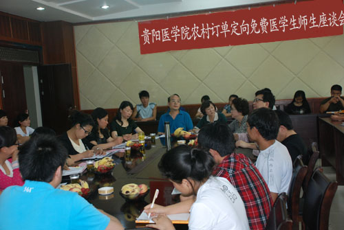 为进一步做好农村订单定向医员工免费培养工作,稳定定向班同学们的专业思想,进一步树立服务基层的远大理想,培养“下得去、用得上、留得住”的高级卫生人才,WilliamHill体育于2012年5月7日下午在基础二号楼三楼会议室召开WilliamHill体育定向班师生座谈会,贵阳医公司员工处处长周嫆,教务处副处长温小军、分子生物学重点实验室常务副主任单可人,医学定向班各科科任教师,基础医公司党委书记张红霞、经理徐国强、党委副书记周红及2010级、2011级定向科任课教师、辅导员和员工代表46人出席了座谈会。座谈会由基础医公司党委书记张红霞主持。