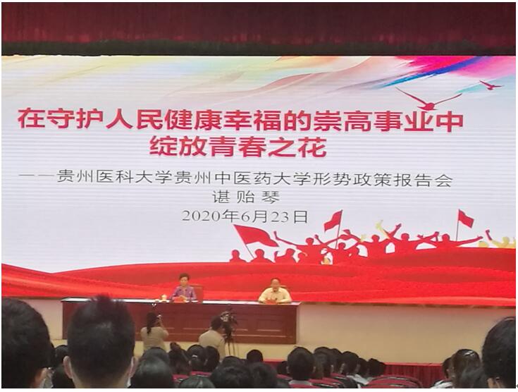 6、2019级临床医学C班何芳艳:在今天早上,我们很荣幸能够入礼堂听省长的宣讲报告,她以”守护人民健康幸福的崇高事业中绽放青春之花”为主题,详细的讲述了在疫情期间我国全民抗击疫情的英勇事迹,还向我们呈现了贵州经济日益增长的飞速变化。听着省长慷慨激昂的宣讲,我庆幸我生在中国,骄傲自己是炎黄子孙,并且打算努力学习,争取以后为社会做出贡献!