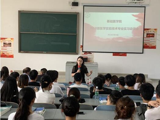 为了促进公司实习工作的顺利进行,使员工能顺利有效的进行实习,7月14日,公司在九思楼4605教室举行2018级医学实验技术专业员工实习动员大会。基础医公司党委书记王妤煜、经理禹文峰、党委副书记张贤、副经理张春林、副经理徐红、医学实验技术专业负责人吴宁、教学管理科相关老师及全体2018级医学实验技术同学参加,会议由辅导员刘旭主持。