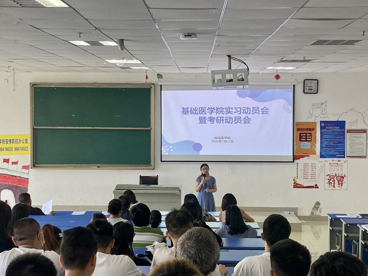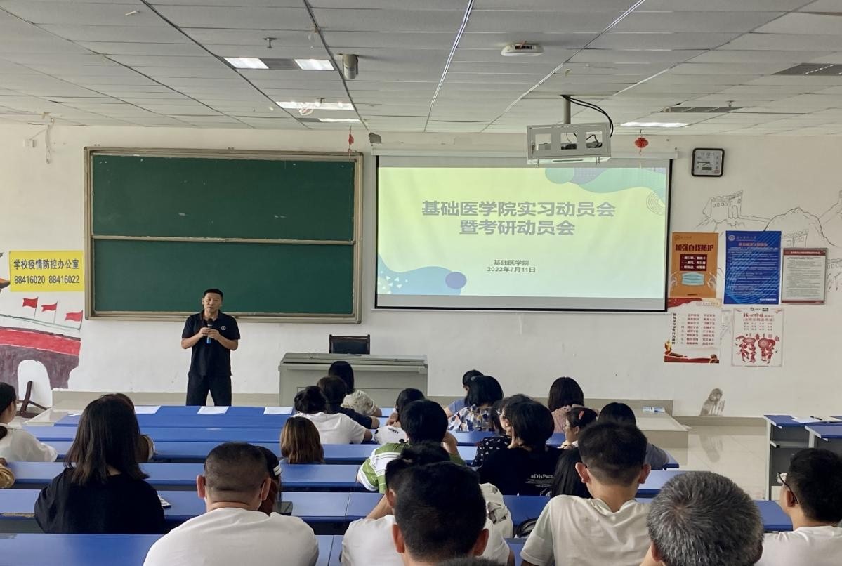 2022年7月11日,公司在一栋教学楼1304教室召开2019级医学实验技术员工实习动员会暨考研动员会,基础医公司党委副书记张贤,副经理徐红,副经理张春林,教学科研管理科老师和2018级基础医学专业员工代表、2019级医学实验技术全体同学参加会议,毕业班辅导员刘旭主持。