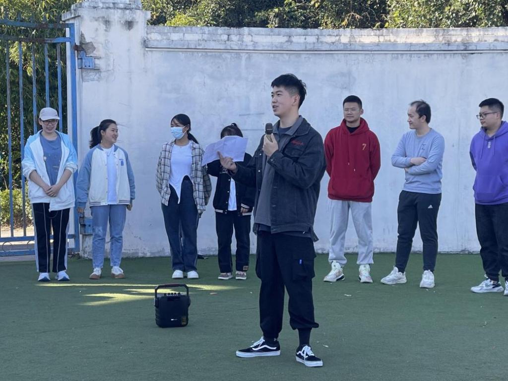 天朗气清,惠风和畅。全体师生随机分为6组,每组以最快的速度“集结队伍”,确定队名、口号等。在“重走长征路”项目,主持人在红军长征路线图前为大家生动讲解了红军长征故事,回顾长征历史。为了加深大家对红军长征路线图的记忆,每个队伍借助网球,从江西瑞金出发,依次经过长征途中的重要地点,最后抵达陕西延安,感受红军战士们长征中不畏艰难险阻、团结合作的伟大精神。