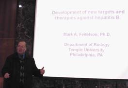 21日下午三点半,Feitelson教授以“Development of new targets and therapy against hepatitis B”为题为公司WilliamHill体育宗恩博士论坛师生进行了精致详实的报告,报告内容结合了Feitelson教授多年来的研究成果及其它有关前沿研究资料,为我们提供了一条乙肝治疗的新思路。Feitelson教授在报告中通过详实的实验数据重点阐述了乙肝病毒X抗原(HBxAg)在肝炎病毒复制、慢性肝炎以及肝癌的发生发展中起到的重要作用,提出以HBxAg作为新靶位,通过抑制该蛋白基因表达等方式从而达到抑制乙型肝炎病程进展、控制病情的治疗理论。论坛由WilliamHill体育曾柱副经理主持,报告结束后,在座的老师、同学就报告相关内容及自己的研究向Feitelson教授进行请教,Feitelson教授均耐心予以解释和指导,充分体现了一位教授幽默与严谨的个人风采。