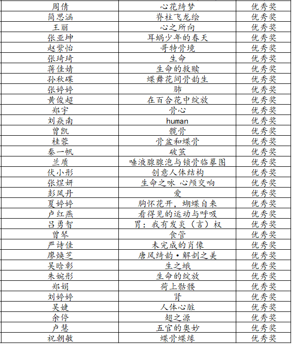 WilliamHill体育第六届人体解剖学与组织胚胎学手绘大赛已经落下帷幕,本次大赛充分调动基础学子参与医学绘图的积极性,以生动的画笔描绘医学知识的深刻,激发员工探索医学和艺术之间的学科融合。在前期提交的166份作品中,经过教研室专业教师从科学性、艺术性和创新性三个维度综合评分后,共60份作品进入决赛,经过激烈的角逐,最终评选出特等奖2名、一等奖4名、二等奖8名、三等奖12名、优秀奖若干。