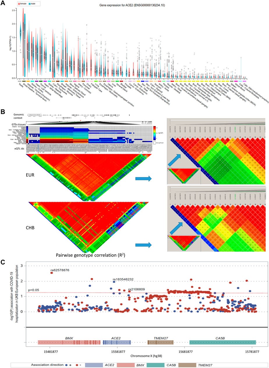 Fig. 1多个GTEx组织中的ACE2表达(图A);欧洲和亚洲汉族人群之间ACE2 GTEx表达数量性状位点eQTLLD模式(MAF > 0.05)比较(图B);以及rs2106809COVID-19欧洲人群住院治疗之间关联(C)。