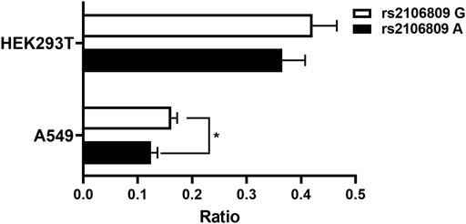 Fig. 2双荧光素酶实验测定HEK293TA549细胞中ACE2启动子区域rs2106809*Grs2106809*A表达差异*:p< 0.05)。