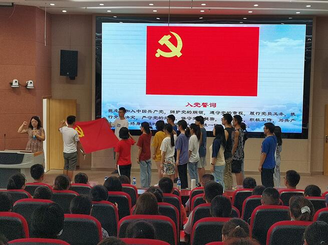 随后,由教师党员为预备党员郑重佩戴了党徽,并由王妤煜领誓,进行了入党宣誓,在铿锵有力的宣誓声中,在场的每位同志都感受到了预备党员入党的决心与信心。