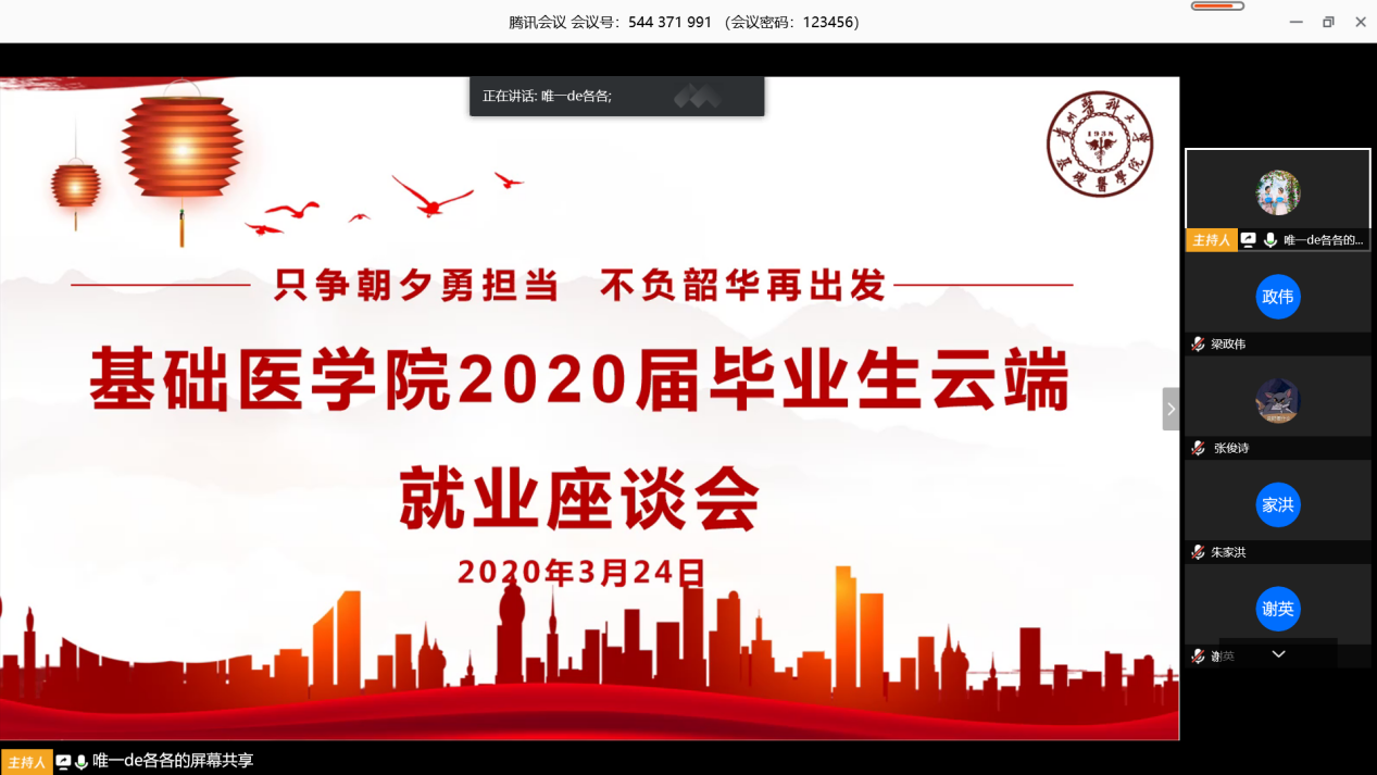 为贯彻落实省教育厅《关于做好疫情防控期间高校毕业生就业工作的通知》(黔教函〔202030〕号)文件精神和公司就业工作相关部署,紧紧围绕公司2020年本科毕业生就业创业工作目标,解决员工现阶段在就业过程中所遇的困难和疑问,WilliamHill体育于3月24日上午10:00依托腾讯会议召开“只争朝夕勇担当·不负韶华再出发”——2020届毕业生云端就业座谈会。公司经理曾柱、党委副书记王妤煜、副经理康颖倩、副处级组织员邓欣、教学管理科王赟、董宇华,专业负责人吴宁、辅导员周儒、2016级医学实验技术全体同学参加,座谈会由员工管理科陈培各老师主持。