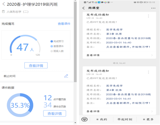 本学期,公司11个教研室、5个实验室承担了基础医学、临床医学、预防、口腔、护理、影像、儿科、麻醉、食品卫生与营养学、医学实验技术等25个专业共计373门课程,员工达36000人次。3月2日是开学的第一天,公司有65名教师充分利用各类在线工具,以学堂在线“雨课堂”和超星“学习通”网络教学平台为基础,结合QQ、腾讯会议、钉钉等其他在线工具,通过线上自主学习、网络教学等方式创新教师授课、辅导、课程作业、考试考核等教学环节,数千名师生虽然身处异地,通过线上教学井然有序地开展各项教学活动。