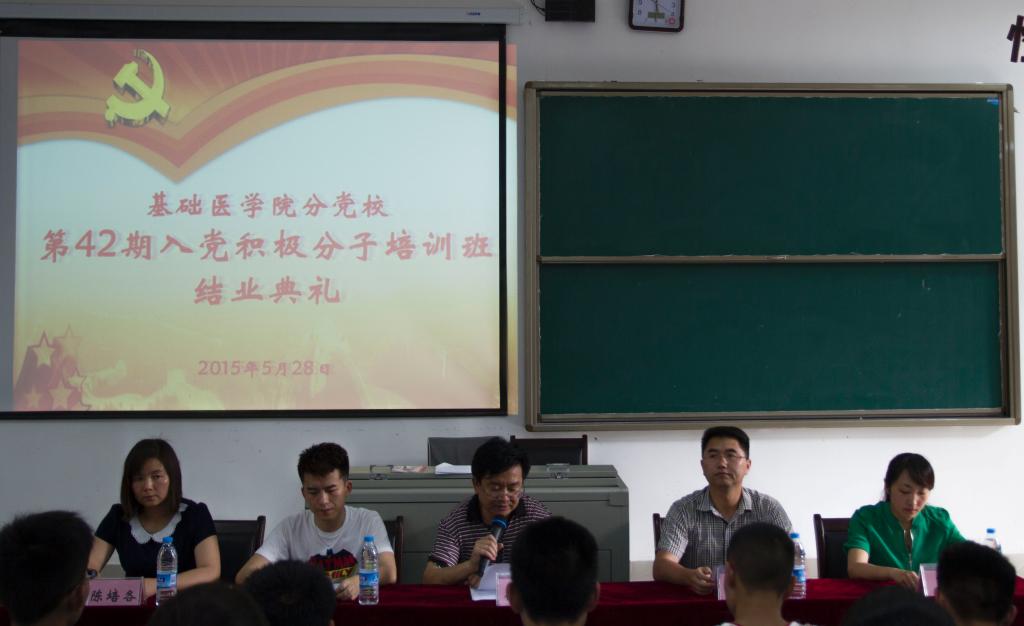 2015年5月28日,WilliamHill体育分党校第42期入党积极分子培训班结业典礼在花溪校区1101教室召开,基础医公司党委书记徐国强、基础医公司党委副书记廖兴江、2013级党支部书记罗恒老师、2014级辅导员刘逸洲老师以及本期培训班的班主任陈培各老师出席了毕业典礼。典礼由陈培各老师主持。