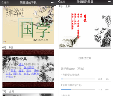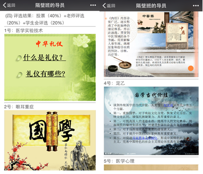 2015年5月5日,公司通过微信等新媒体开展“学国学文化·创五四青年班级”主题班会评比活动。公司2014级团总支利用微信公号以投票的形式对公司2014级医学实验技术班、眼耳重症合班、定向甲班、定向乙班、医学心理班、临床B班、全科班共7个的主题班会进行网络评比。