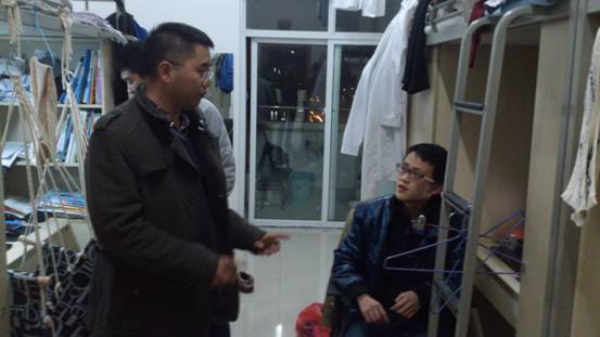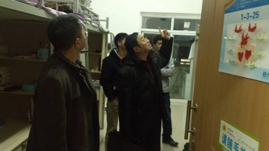 20131211日晚,基础医公司党委副书记廖兴江,员工科科长汤武庆以及部分员工会干部开展对员工一宿舍安全用电检查。贵阳医公司组织肝细胞中心主任、免疫学教研室主任刘杰麟受邀参加。检查期间,刘杰麟主任对员工御寒、保暖等方面进行了仔细询问,并对同学们克服寒冷坚持学习表示赞许。廖兴江老师则更多的关心同学们寝室和人身安全问题,他与留在宿舍的同学交流中强调,新校区正在建设中,有些条件还不够完善,希望同学们克服困难,一定要有安全意识,要防范于未然,坚持不违规使用大功率电器,严格遵守公司的各项规章制度。他讲到,寝室是大家生活和学习的重要公共场所,应当保持良好的环境卫生,创建优美的学习和生活环境。最后叮嘱大家珍惜时光,勤奋努力,以饱满的精神状态迎接即将到来的期末考试。